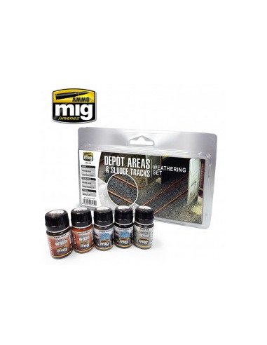 Set de 5 colores ppara envejecer todo tipo de zonas de depósitos y zonas de mantenimiento de vías de ferrocarril. Botes 35 mL.