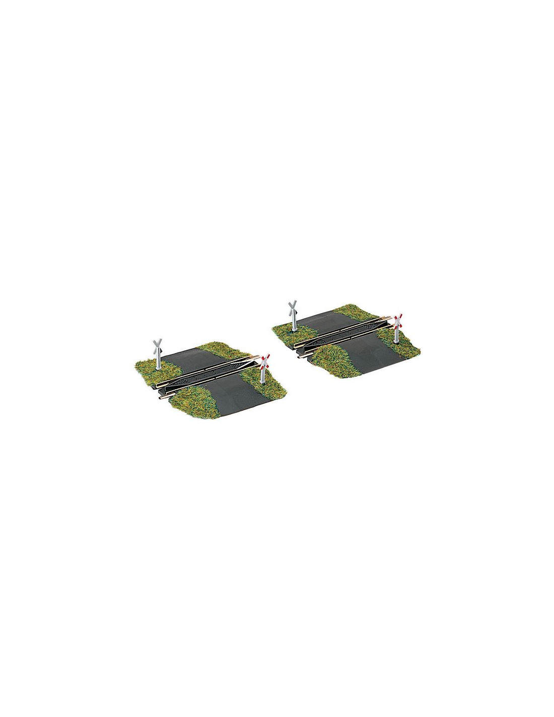 2 x 55,5 mm lengths of track looking like unguarded crossings, with warning crosses. Single track direction, controlled by diodes and isolating rail joiners. Not suitable for digital operation.